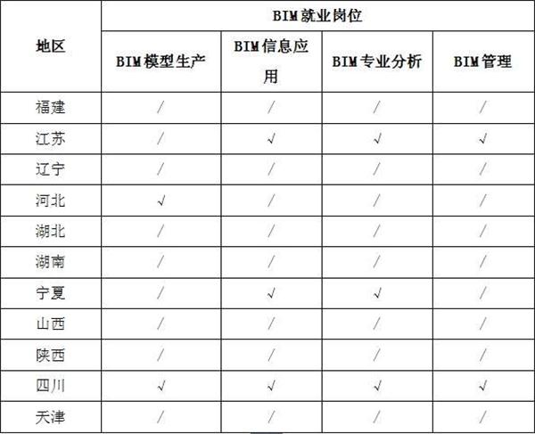 3、就業(yè)崗位分布。從11個省市的BIM就業(yè)崗位分布來看,不同地區(qū)的企業(yè)對BIM人才的崗位需求也各不相同,BIM技術應用發(fā)達的地區(qū)更需要能將BIM技術與生產(chǎn)過程融合的復合型人才,不局限于BIM建模工作,例如江蘇省企業(yè)招聘的人員以BIM信息應用,BIM專業(yè)分析和BIM項目管理為主。